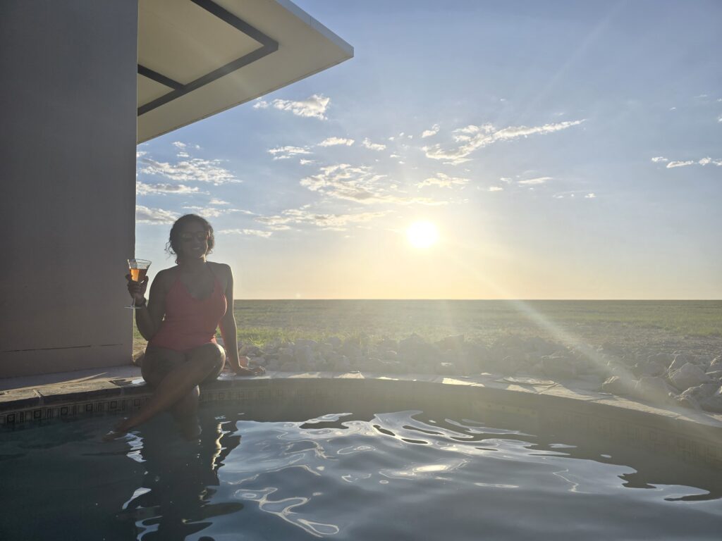 Our stay for three nights was at Etosha King Nehale, in the north of the park, 5 hours from Windhoek. As it was our first taste of our ‘African experience’, it felt out of this world. The stay included our own pool (ice cold and with a few dead bugs in it), being totally awe-struck by the endless horizon and fried crickets as a starter.
